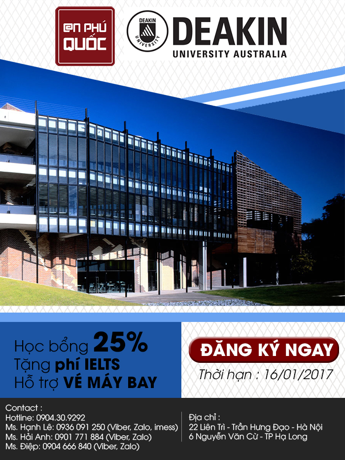 Khi đăng ký làm hồ sơ du học đại học Deakin - Úc qua An Phú Quốc cho kỳ nhập học tháng 2/2017, bạn có cơ hội nhận được nhiều ưu đãi cực hấp dẫn với gói học bổng từ trường đại học Deakin và công ty An Phú Quốc. Hãy để An Phú Quốc mang giấc mơ du học Úc đến gần trong tầm tay bạn.