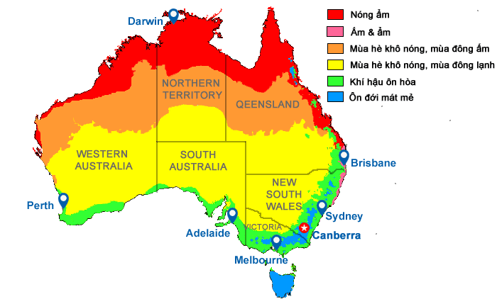 Úc có hai khí hậu đặc trưng: khí hậu nhiệt đới ở phía Bắc và khí hậu ôn đới ở phía Nam. Ở miền bắc, với khí hậu nhiệt đới, mùa hè bắt đầu từ tháng 1 đến tháng 3 và khí hậu ẩm. Mùa đông khí hậu khá khô. Vùng nội địa vừa nóng lại khô. Ở phía nam, với khí hậu ôn đới, mùa hè nóng ấm còn mùa đông có mưa, khí hậu cũng ôn hoà.