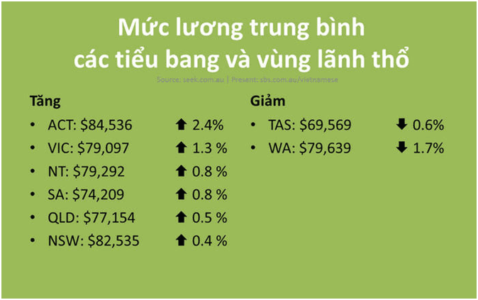 Mức lương trung bình ở Lãnh thổ Thủ đô cao nhất và tốc độ tăng lương cũng cao nhất trên cả nước, trong khi đó mức lương trung bình ở tiểu bang Tasmania thấp nhất và đang có chiều hướng sụt giảm.