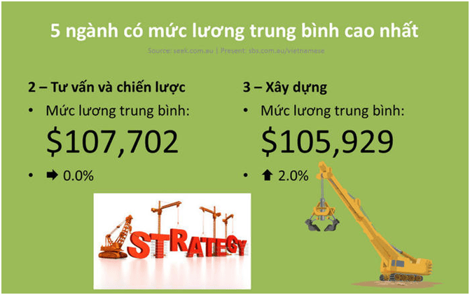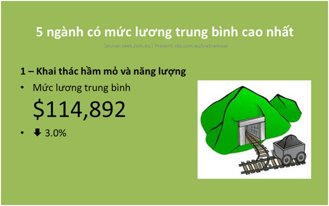 Lương ngành kỹ nghệ hầm mỏ tuy có sụt giảm nhưng vẫn giữ vị trí đứng đầu khi nói đến mức lương trung bình cao nhất Úc, bốn vị trí tiếp theo lần lượt là tư vấn chiến lược, xây dựng, kỹ sư và công nghệ thông tin ICT.