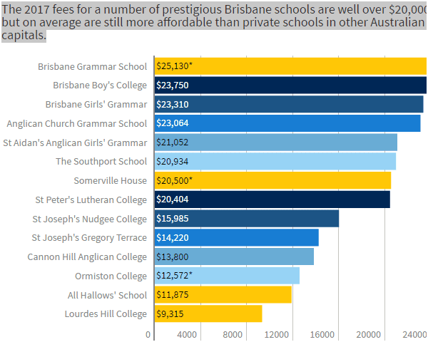 Năm 2017, học phí của nhiều trường tư uy tín tại Brisbane vào khoảng hơn 20,000 đô - nhưng xét về trung bình vẫn thấp hơn mức học phí tại các trường tư ở những thành phố thủ phủ còn lại.