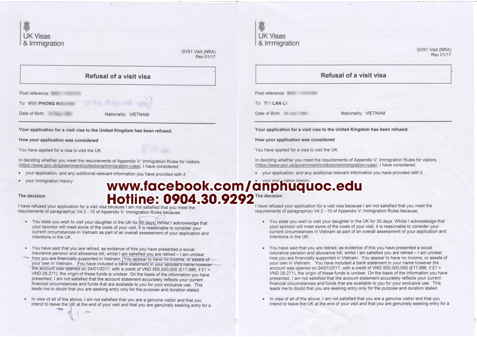 Cô L.T.Lan và chú N.V.Phòng có con trai và con gái hiện đang sinh sống và học tập tại Anh Quốc. Với mong mỏi được sang thăm con, cô chú đã nộp hồ sơ lên Đại sứ quán Anh quốc để xin visa thăm thân. Tuy nhiên, cô chú đã bị Đại Sứ Quán Anh từ chối cấp visa vì lý do muôn thuở: không chứng minh được khả năng tài chính bởi thu nhập của cô chú chỉ có lương hưu là 3,5 triệu 1 người và 1 căn nhà chưa sang tên.