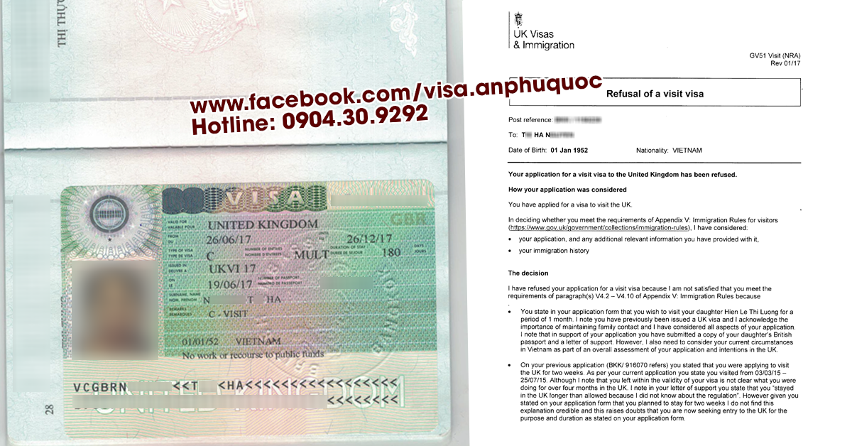 An Phú Quốc với 10 năm kinh nghiệm luôn tự hào là công ty có khả năng chữa thành công các hồ sơ đã từng bị từ chối cấp visa với tỷ lệ cao. Mới đây nhất là trường hợp của cô N.T.Hà. Hồ sơ của cô Hà có quá nhiều điểm bất lợi khiến việc xin visa thăm thân Anh quốc trở nên khá gian nan. Vậy mà cuối cùng An Phú Quốc cũng đã thành công trong việc mang về tấm visa thăm thân Anh cho cô Hà.