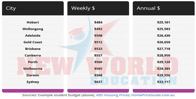 Bảng chi phí sinh hoạt tại một số thành phố của Australia. Nguồn http://studentcities.com.au/cheapest-living-costs/